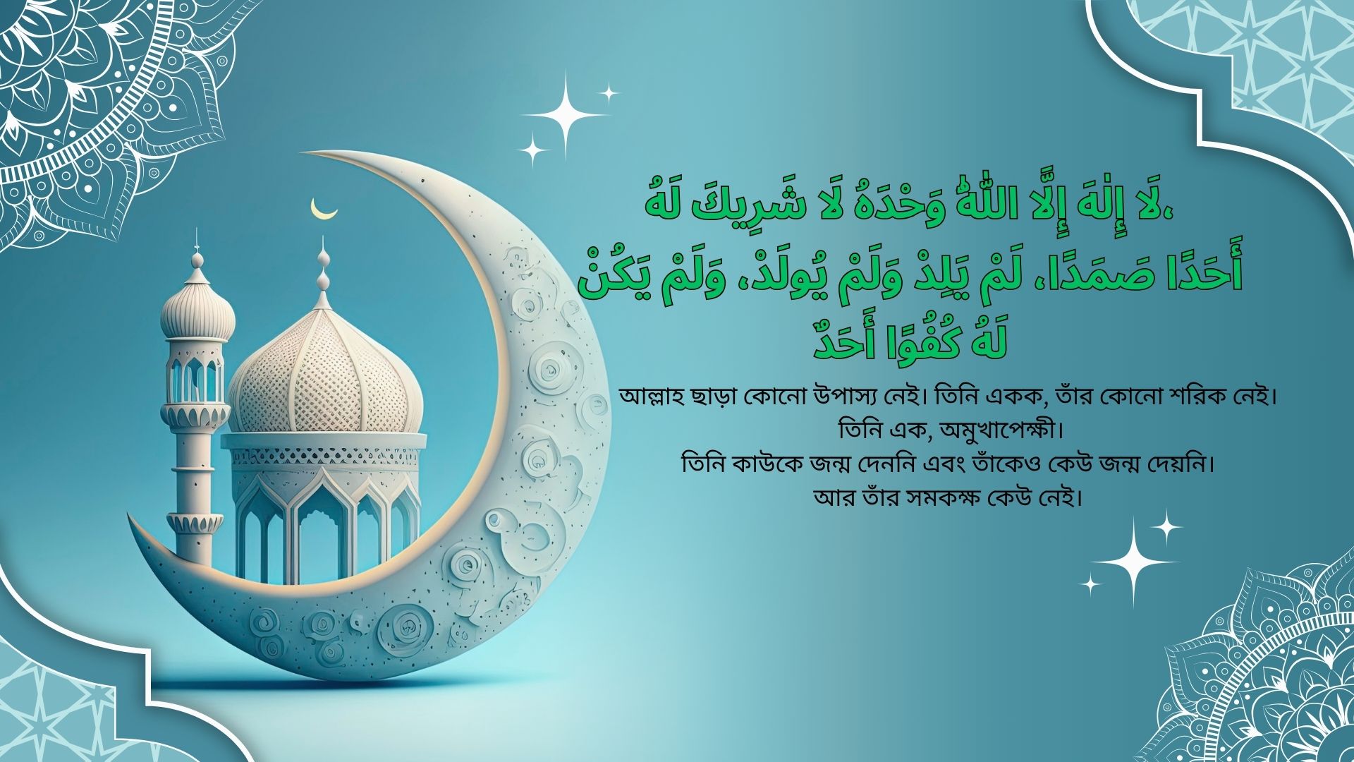 “আল্লাহ ছাড়া কোনো ইলাহ নেই। তিনি এক, তাঁর কোনো শরিক নেই। তিনি অদ্বিতীয়, অমুখাপেক্ষী। তিনি কাউকে জন্ম দেননি এবং তাঁকেও কেউ জন্ম দেয়নি। তাঁর কোনো সমকক্ষ নেই।”