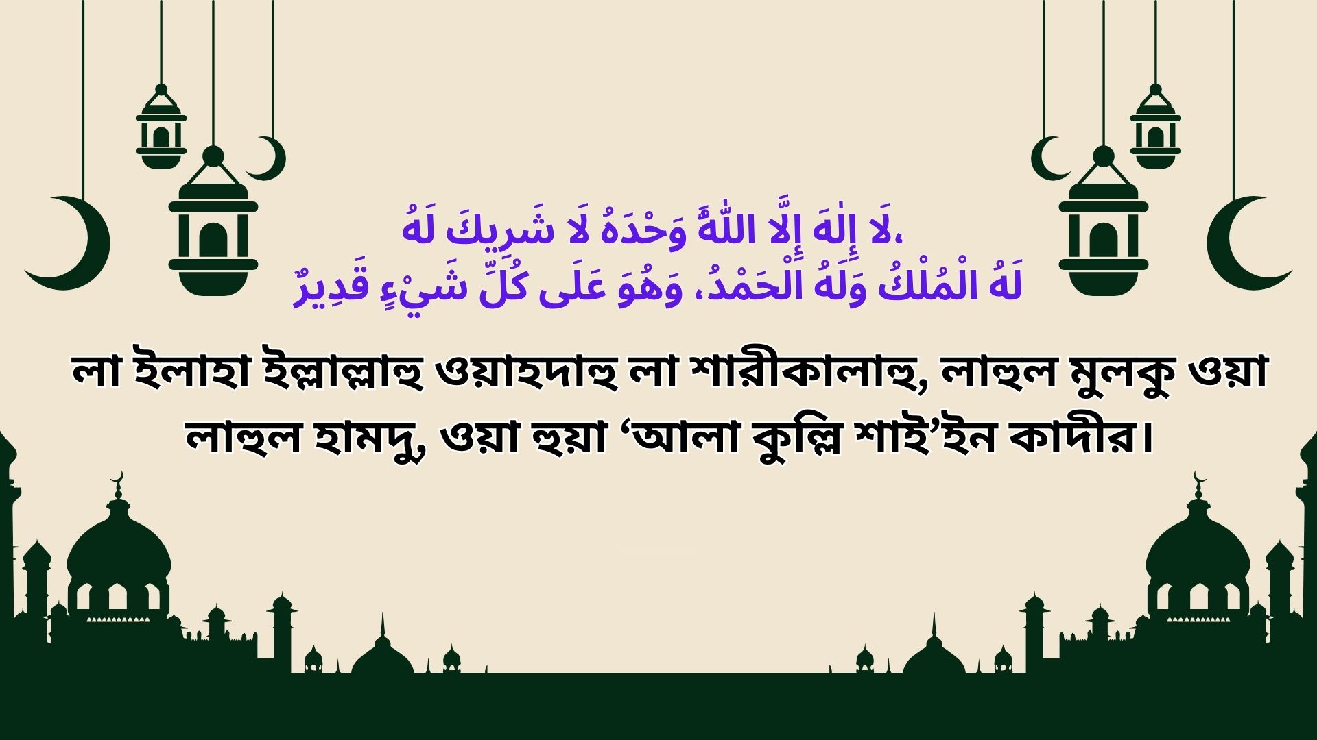 Ų„ŲŽØ§ ØĨŲŲ„Ų°Ų‡ŲŽ ØĨŲŲ„ŲŽŲ‘Ø§ Ø§Ų„Ų„ŲŽŲ‘Ų‡Ų ŲˆŲŽØ­Ų’Ø¯ŲŽŲ‡Ų Ų„ŲŽØ§ Ø´ŲŽØąŲŲŠŲƒŲŽ Ų„ŲŽŲ‡ŲØŒ Ų„ŲŽŲ‡Ų Ø§Ų„Ų’Ų…ŲŲ„Ų’ŲƒŲ ŲˆŲŽŲ„ŲŽŲ‡Ų Ø§Ų„Ų’Ø­ŲŽŲ…Ų’Ø¯ŲØŒ ŲˆŲŽŲ‡ŲŲˆŲŽ ØšŲŽŲ„ŲŽŲ‰ ŲƒŲŲ„ŲŲ‘ Ø´ŲŽŲŠŲ’ØĄŲ Ų‚ŲŽØ¯ŲŲŠØąŲŒ
