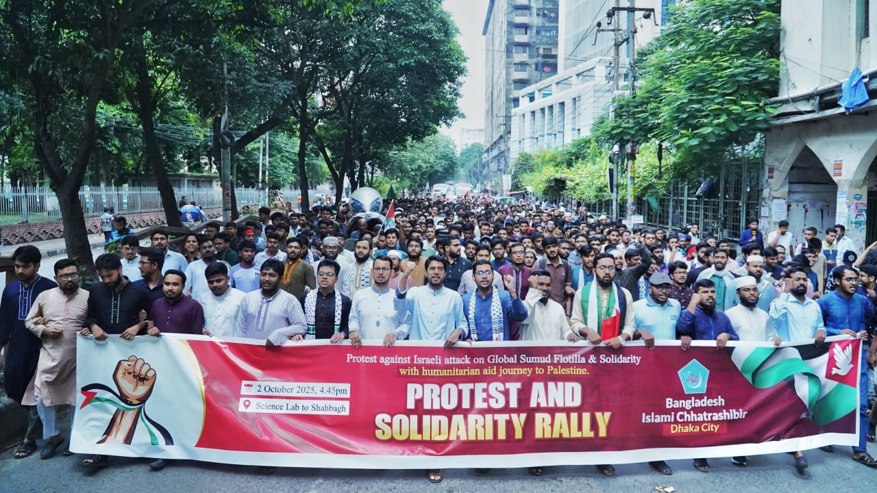 গ্লোবাল সুমুদ ফ্লোটিলার ওপর ইসরায়েলি হামলার প্রতিবাদ এবং ফিলিস্তিনে মানবিক সহায়তা যাত্রায় সংহতি প্রকাশ করে বাংলাদেশ ইসলামী ছাত্রশিবির, ঢাকা মহানগরের উদ্যোগে রাজধানীতে “প্রোটেস্ট অ্যান্ড সলিডারিটি র‌্যালি” অনুষ্ঠিত হয়েছে।