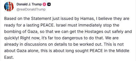 শুক্রবার এক ভিডিও বার্তায় প্রেসিডেন্ট ট্রাম্প জানান, হামাস তার শান্তি পরিকল্পনার আনুষ্ঠানিক জবাব দিয়েছে। এতে গোষ্ঠীটি গাজা উপত্যকার প্রশাসন ফিলিস্তিনি প্রযুক্তিবিদদের (টেকনোক্র্যাট) হাতে হস্তান্তর ও নিজেদের কব্জায় থাকা সকল ইসরায়েলি বন্দিকে মুক্তি দিতে সম্মত হয়েছে। যদিও হামাস তাদের নিরস্ত্রীকরণ প্রসঙ্গে কিছু বলেনি, তবে তারা “মধ্যস্থতাকারীদের মাধ্যমে অবিলম্বে” শান্তি আলোচনায় অংশ নিতে প্রস্তুত বলে জানিয়েছে।