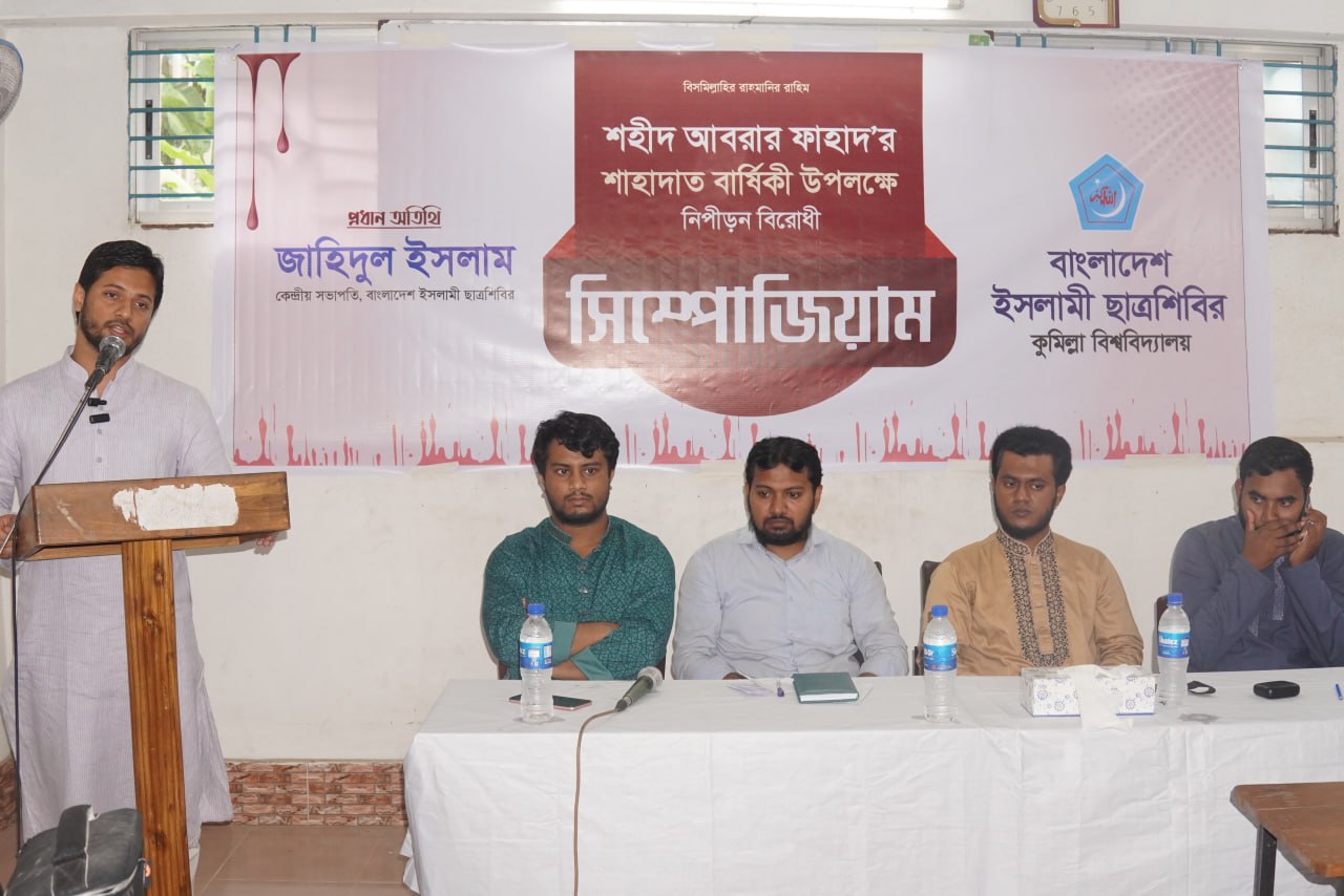 শহীদ আবরার ফাহাদের ৬ষ্ঠ শাহাদতবার্ষিকী উপলক্ষে কুমিল্লা বিশ্ববিদ্যালয় শাখা বাংলাদেশ ইসলামী ছাত্রশিবিরের উদ্যোগে সোমবার ‘নিপীড়ন-বিরোধী দিবস’ পালনের অংশ হিসেবে এক সিম্পোজিয়াম অনুষ্ঠিত হয়েছে।